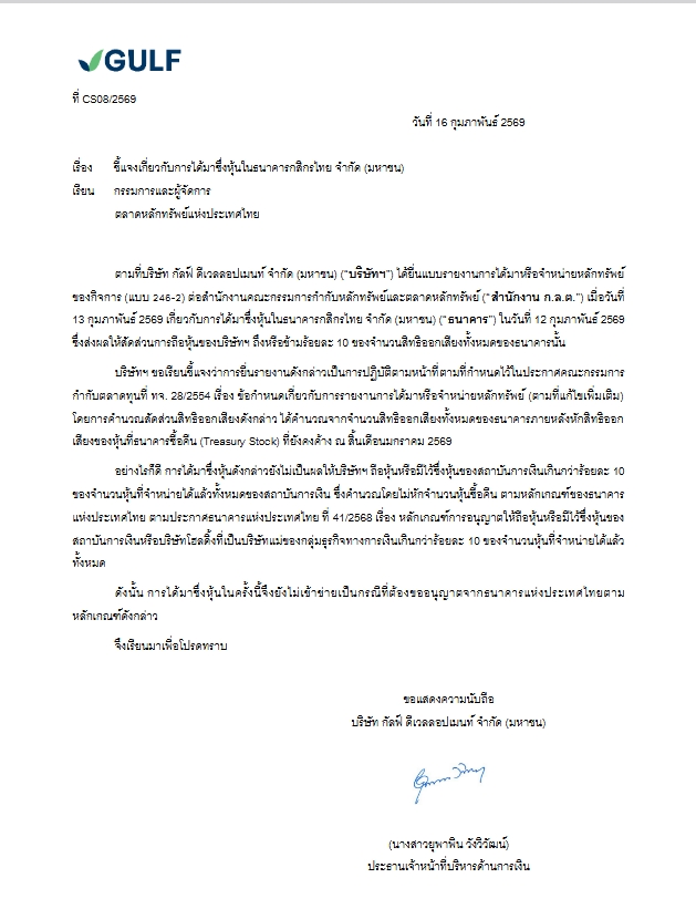 บริษัท กัลฟ์ ดีเวลลอปเมนท์ จำกัด (มหาชน) หรือ GULF แจ้งตลาดหลักทรัพย์ฯ ว่าตามที่บริษัทได้ยื่นแบบรายงานการได้มาหรือจำหน่ายหลักทรัพย์ของกิจการ (แบบ 246-2) ต่อสำนักงานคณะกรรมการกำกับหลักหลักทรัพย์และตลาดหลักทรัพย์ เมื่อวันที่ 13 กุมภาพันธ์ 2569 เกี่ยวกับการได้มาซึ่งหุ้นในธนาคารกสิกรไทย จำกัด (มหาชน) หรือ KBANK ในวันที่ 12 กุมภาพันธ์ 2569 ซึ่งส่งผลให้สัดส่วนการถือหุ้นของบริษัท ถึงหรือข้ามร้อยละ 10 ของจำนวนสิทธิออกเสียงทั้งหมดของธนาคาคารนั้น