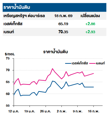 โดยราคาน้ำมันดิบเวสต์เทกซัสซื้อขายเมื่อ 18 ก.พ. 2569 อยู่ที่ 65.19 เหรียญสหรัฐต่อบาร์เรล เพิ่มขึ้น +2.86 เหรียญสหรัฐต่อบาร์เรล และราคาน้ำมันดิบเบรนต์อยู่ที่ 70.35 เหรียญสหรัฐต่อบาร์เรล เพิ่มขึ้น +2.93 เหรียญสหรัฐต่อบาร์เรล