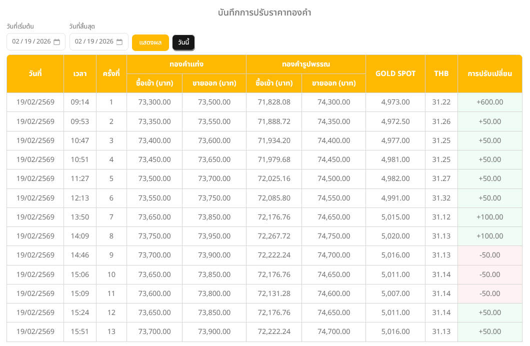 อ่านข่าวต้นฉบับ: ราคาทองวันนี้ (19 ก.พ. 69) ปรับขึ้น 1,000 บาท รูปพรรณบาทละ 74,700 บาท
