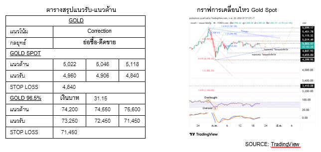 อย่างไรก็ดี หากราคายังไม่หลุด $4,960 ยังมองว่าไม่เสียทรงการดีดเช่นกัน สำหรับกลยุทธ์การลงทุน เสี่ยงซื้อหากราคาไม่หลุด $4,960 หากหลุดชะลอไปซื้อที่ $4,928-4,906 ขายทำกำไรหากราคาไม่ผ่านแนวต้าน $5,022-5,046 (ตัดขาดทุนหากราคาหลุด $4,840)