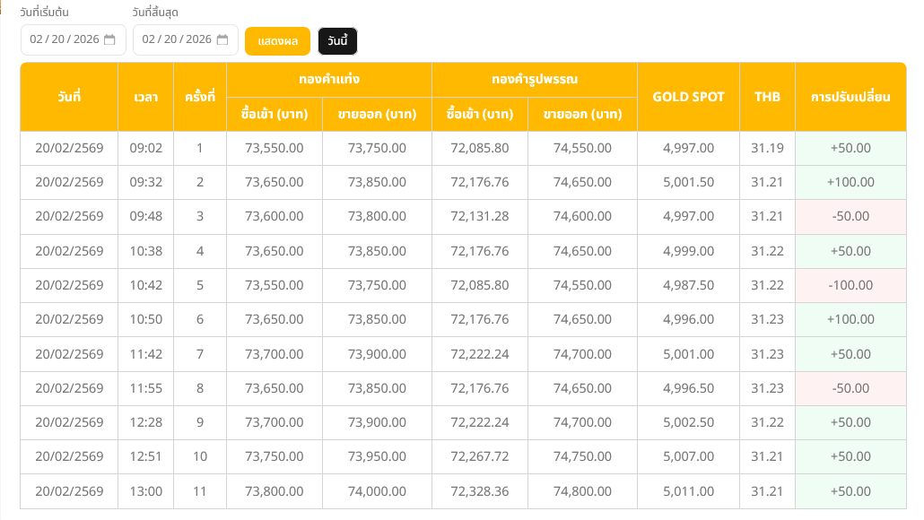 อ่านข่าวต้นฉบับ: ราคาทองวันนี้ (20 ก.พ. 69) ปรับขึ้น 450 บาท รูปพรรณบาทละ 74,950 บาท