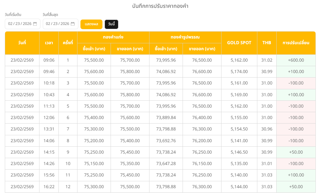 ทองคำแท่งมีราคารับซื้อในประเทศอยู่ที่บาทละ 75,300.00 บาท ขายออกบาทละ 75,500.00 บาท ตามประกาศครั้งที่ 12