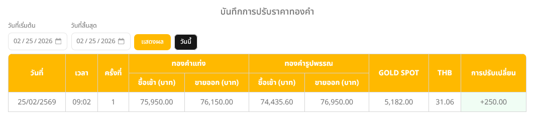 อ่านข่าวต้นฉบับ: ราคาทองวันนี้ (25 ก.พ. 69) ปรับขึ้น 250 บาท รูปพรรณบาทละ 76,950 บาท