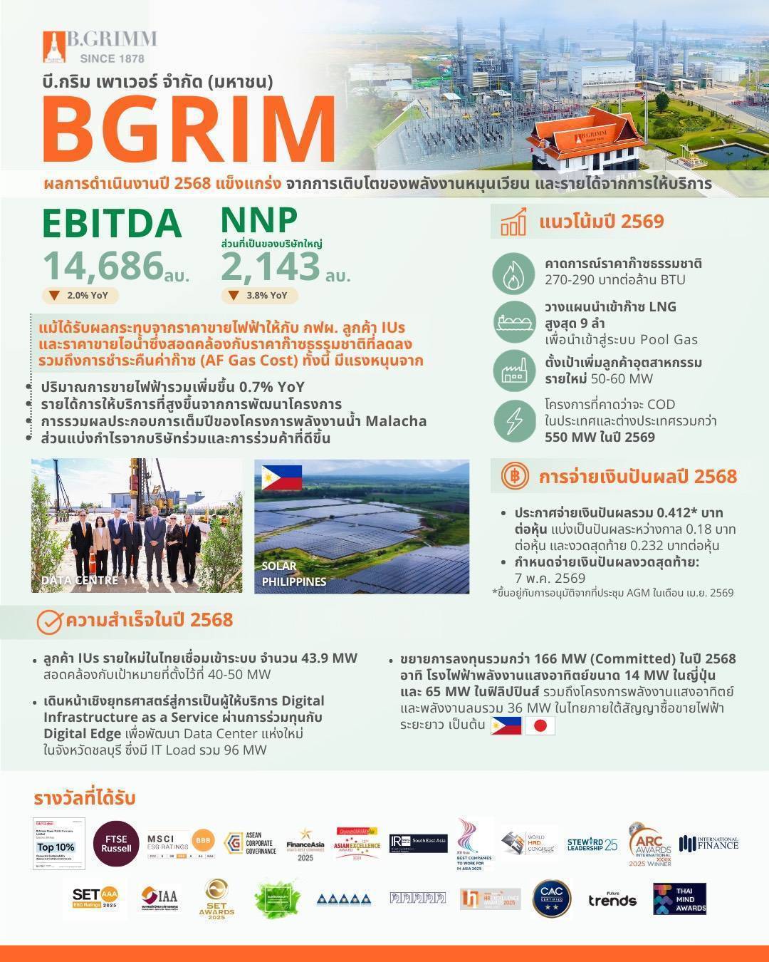 บี.กริม เพาเวอร์ เผยผลประกอบการปี 2568 โชว์กำไรสุทธิ 2,143 ล้านบาท พร้อมเดินหน้าขยายการผลิตและเข้าร่วมลงทุนกับบริษัทพลังงานหมุนเวียน ในประเทศต่าง ๆ อย่างต่อเนื่อง ส่วนในไทยยังพัฒนาแพลตฟอร์มดาต้าเซ็นเตอร์แห่งใหม่ ในจังหวัดชลบุรี พร้อมประกาศจ่ายปันผลเพิ่ม 7 พ.ค.นี้