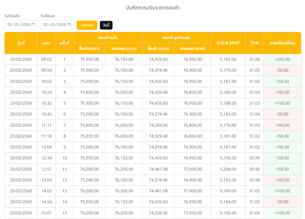 สำหรับทองรูปพรรณ 96.5% รับซื้ออยู่ที่บาทละ 74,526.56 บาท ราคาขายออกบาทละ 77,050.00 บาท ขณะที่ราคาทองคำตลาดโลก (Gold Spot) อยู่ที่ 5,190 เหรียญสหรัฐ/ออนซ์
