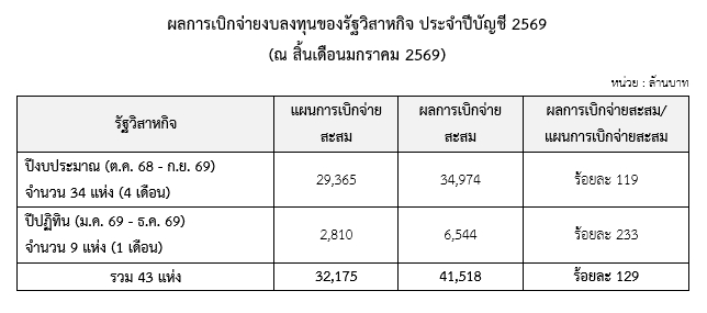 ประกอบด้วย การเบิกจ่ายงบลงทุนของรัฐวิสาหกิจปีงบประมาณ (ตั้งแต่เดือนตุลาคม 2568 – เดือนมกราคม 2569) 34 แห่ง จำนวน 34,974 ล้านบาท หรือคิดเป็นร้อยละ 119 ของแผนการเบิกจ่ายสะสม และรัฐวิสาหกิจปีปฏิทิน (เดือนมกราคม 2569) 9 แห่ง จำนวน 6,544 ล้านบาท หรือคิดเป็นร้อยละ 233 ของแผนการเบิกจ่ายสะสม