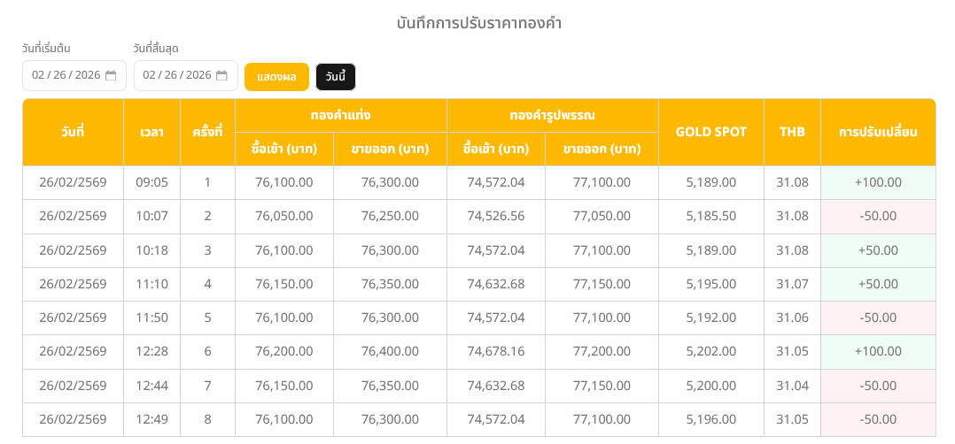 อ่านข่าวต้นฉบับ: ราคาทองวันนี้ (26 ก.พ. 69) ปรับขึ้น 50 บาท รูปพรรณบาทละ 77,050 บาท