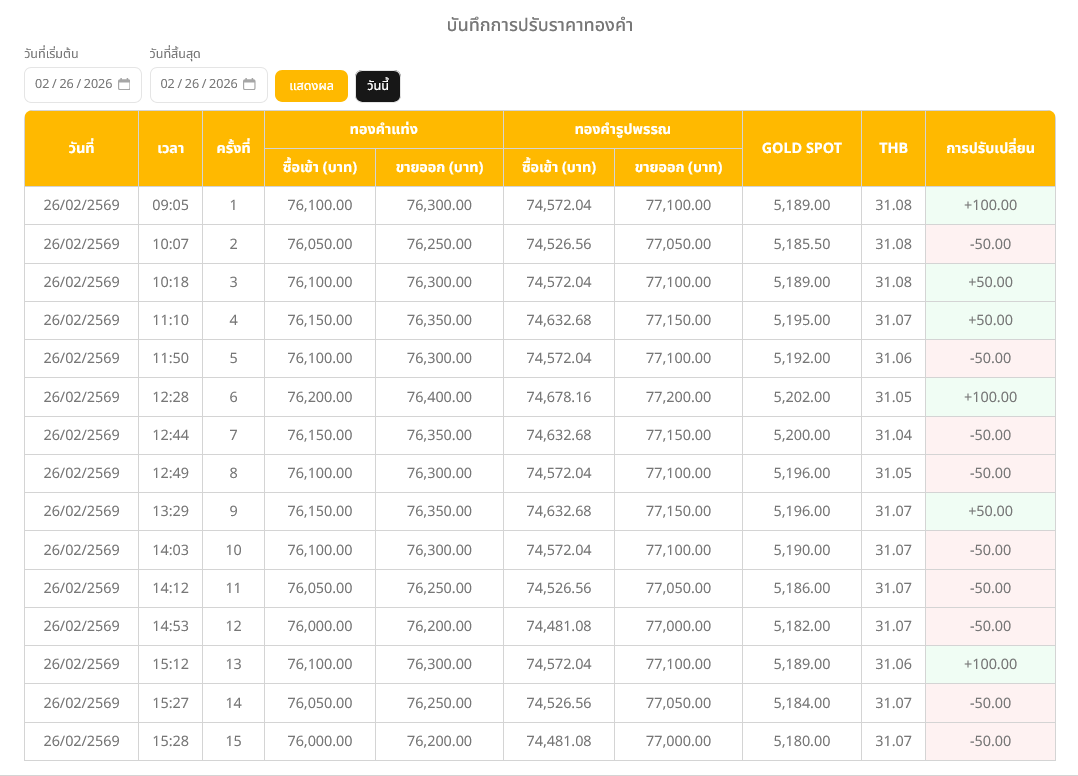 สำหรับทองรูปพรรณ 96.5% รับซื้ออยู่ที่บาทละ 74,481.08 บาท ราคาขายออกบาทละ 77,000.00 บาท ขณะที่ราคาทองคำตลาดโลก (Gold Spot) อยู่ที่ 5,180 เหรียญสหรัฐ/ออนซ์