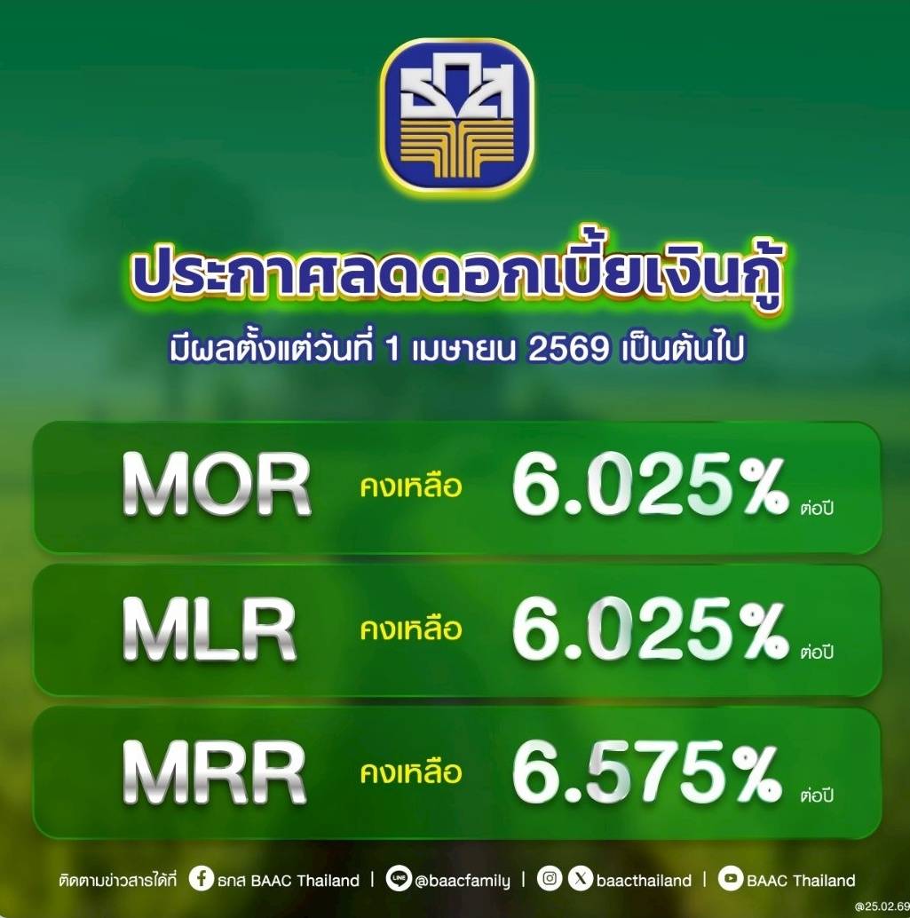 รายงานจากธนาคารเพื่อการเกษตรและสหรณ์การเกษตร (ธ.ก.ส.) เปิดเผยว่า ธนาคารได้ประกาศลดดอกเบี้ยเงินกู้ ดังนี้ MOR คงเหลือ 6.025% ต่อปี จากเดิม 6.125%, MLR คงเหลือ 6.025% ต่อปี และ MRR คงเหลือ 6.575% ต่อปี จากเดิม 6.625%