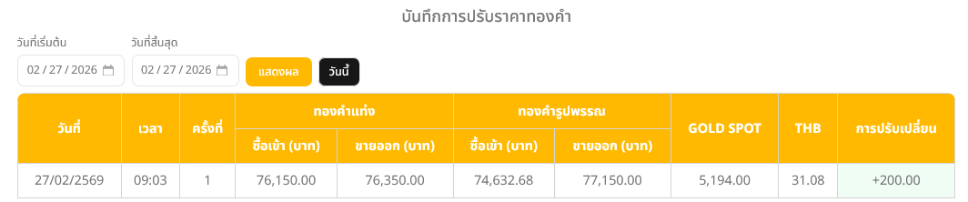 สำหรับทองรูปพรรณ 96.5% รับซื้ออยู่ที่บาทละ 74,632.68 บาท ราคาขายออกบาทละ 77,150.00 บาท ขณะที่ราคาทองคำตลาดโลก (Gold Spot) อยู่ที่ 5,194 เหรียญสหรัฐ/ออนซ์