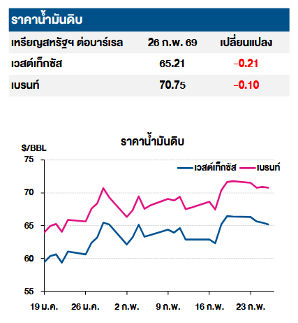 โดยราคาน้ำมันดิบเวสต์เทกซัสซื้อขายเมื่อ 26 ก.พ. 69 อยู่ที่ 65.21 เหรียญสหรัฐต่อบาร์เรล ลดลง -0.21 เหรียญสหรัฐ และราคาน้ำมันเบรนต์อยู่ที่ 70.75 เหรียญสหรัฐต่อบาร์เรล ลดลง -0.10