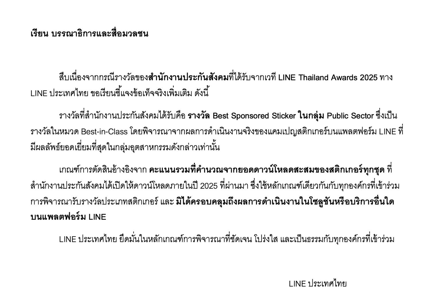 รายงานข่าวจาก LINE ประเทศไทย เปิดเผยว่า สืบเนื่องจากกรณีรางวัลของ “สำนักงานประกันสังคม” ที่ได้รับจากเวที LINE Thailand Awards 2025 ทาง LINE ประเทศไทย ขอเรียนชี้แจงข้อเท็จจริงเพิ่มเติม ดังนี้