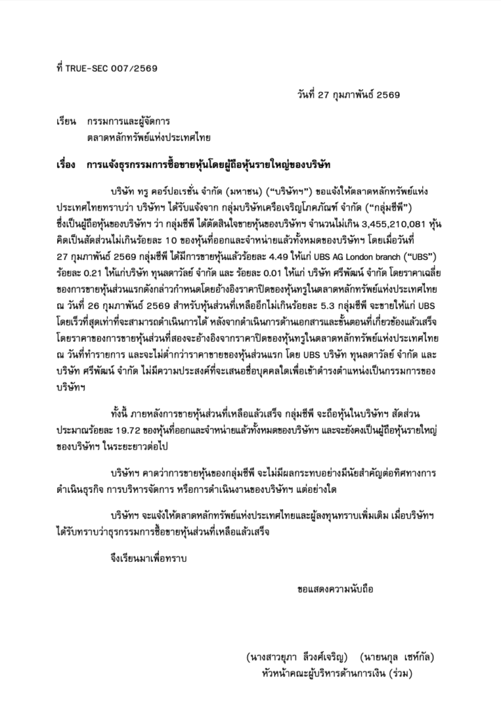 โดยเมื่อวันที่ 27 กุมภาพันธ์ 2569 กลุ่ม ซี.พี. ได้มีการขายหุ้นแล้วร้อยละ 4.49 ให้แก่ UBS AG London branch (UBS) ร้อยละ 0.21 ให้แก่บริษัท ทุนลดาวัลย์ จํากัด และร้อยละ 0.01 ให้แก่ บริษัท ศรีพัฒน์ จํากัด โดยราคาเฉลี่ยของการขายหุ้นส่วนแรกดังกล่าวกําหนดโดยอ้างอิงราคาปิดของหุ้นทรูในตลาดหลักทรัพย์แห่งประเทศไทย ณ วันที่ 26 กุมภาพันธ์ 2569