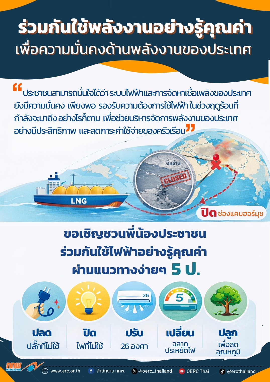 “สำนักงาน กกพ. ขอเชิญชวนพี่น้องประชาชนร่วมกันใช้พลังงานอย่างรู้คุณค่า เพื่อช่วยลดการใช้พลังงานและเสริมสร้างความมั่นคงด้านพลังงานของประเทศ ผ่านแนวทางง่าย ๆ 5 ป. ได้แก่ ปลด หรือถอดปลั๊กเครื่องใช้ไฟฟ้าเมื่อเลิกใช้งาน ปิด ไฟหรืออุปกรณ์ไฟฟ้าที่ไม่จำเป็น ปรับ อุณหภูมิเครื่องปรับอากาศที่ 26 องศาเซลเซียส เปลี่ยนมาใช้อุปกรณ์ประหยัดไฟเบอร์ 5 และปลูกต้นไม้ เพิ่มพื้นที่สีเขียวเพื่อลดอุณหภูมิภายในบ้าน โดยทั้ง 5 แนวทางนี้จะช่วยให้ประชาชนสามารถลดการใช้พลังงาน และลดภาระค่าไฟฟ้าของครัวเรือนได้ควบคู่กัน”