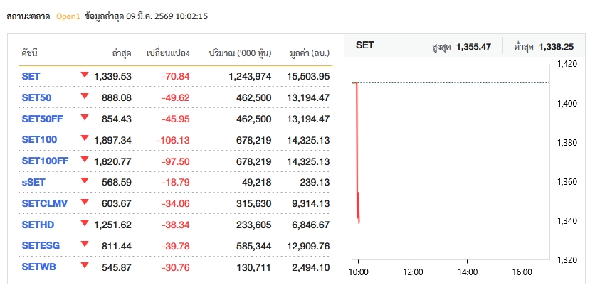 ผู้สื่อข่าวรายงานว่า ตลาดหุ้นไทยเช้านี้ (9 มี.ค.) เปิดตลาดดัชนีดิ่งทันที 70.84 จุด (-5.02% โดยดัชนี SET ปรับลงมาอยู่ที่ 1,339.53 จุด (10.02 น.)