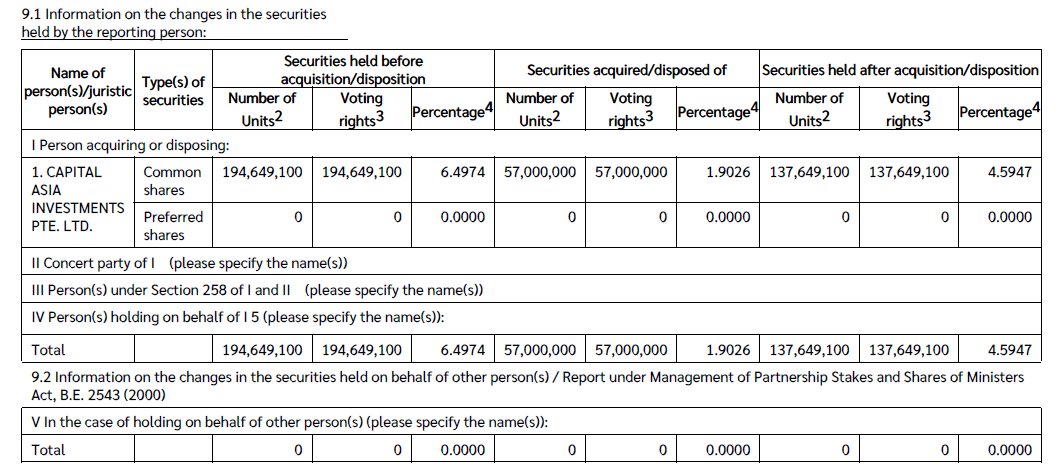 ก่อนการจำหน่ายหุ้นกองทุน Capital Asia Investments (CAI) ถือหุ้น BCPG จำนวน 194,649,100 หุ้น คิดเป็นสัดส่วน 6.4974% ของสิทธิออกเสียงทั้งหมด ต่อมาได้จำหน่ายหุ้นออกจำนวน 57,000,000 หุ้น หรือคิดเป็น 1.9026% ส่งผลให้หลังการทำรายการยังคงถือหุ้นอยู่จำนวน 137,649,100 หุ้น หรือคิดเป็น 4.5947%