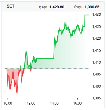 ผู้สื่อข่าวรายงานว่า ตลาดหุ้นไทยวันนี้ (12 มีนาคม 2569) ดัชนี SET ปิดที่ระดับ 1,429.80 จุด เพิ่มขึ้น 22.46 จุด (+1.60%) มูลค่าการซื้อขายรวม 64,496.48 ล้านบาท แบ่งเป็นนักลงทุนสถาบันซื้อสุทธิ 2,606.30 ล้านบาท บัญชีบริษัทหลักทรัพย์ซื้อสุทธิ 320.26 ล้านบาท นักลงทุนต่างประเทศขายสุทธิ 2,421.79 ล้านบาท และนักลงทุนในประเทศขายสุทธิ 504.77 ล้านบาท