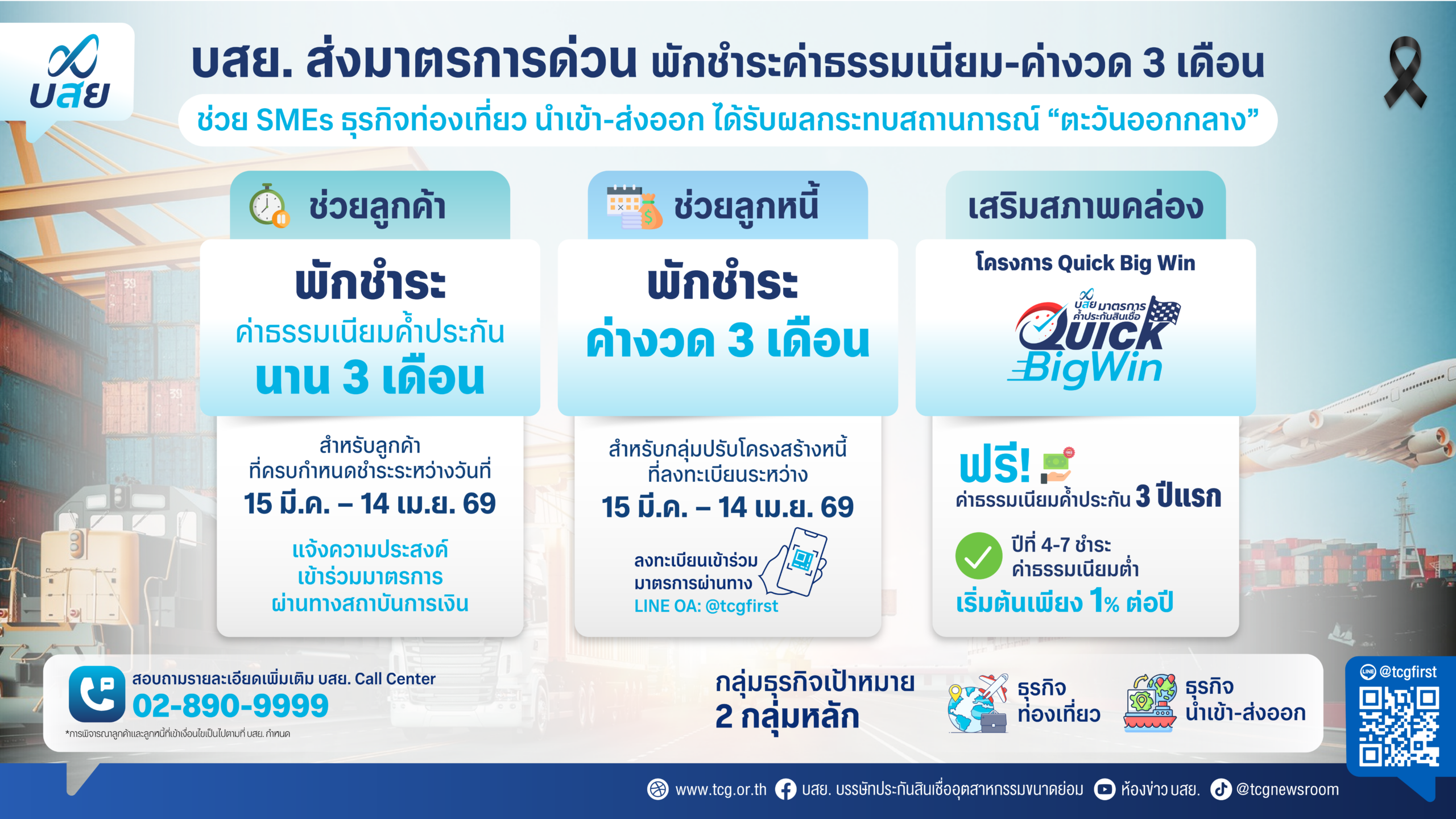 สำหรับผู้ประกอบการ SMEs ลูกค้าและลูกหนี้ บสย. กลุ่มธุรกิจท่องเที่ยว ธุรกิจนำเข้า-ส่งออกที่เกี่ยวเนื่อง ที่ได้รับผลกระทบจากสถานการณ์ความขัดแย้งในตะวันออกกลาง สามารถสอบถามข้อมูลและรายละเอียดการเข้าร่วมมาตรการ ได้ที่สำนักงานเขตในพื้นที่ หรือช่องทาง LINE OA TCG First : @tcgfirst และ บสย. Call Center โทร. 0-2890-9999