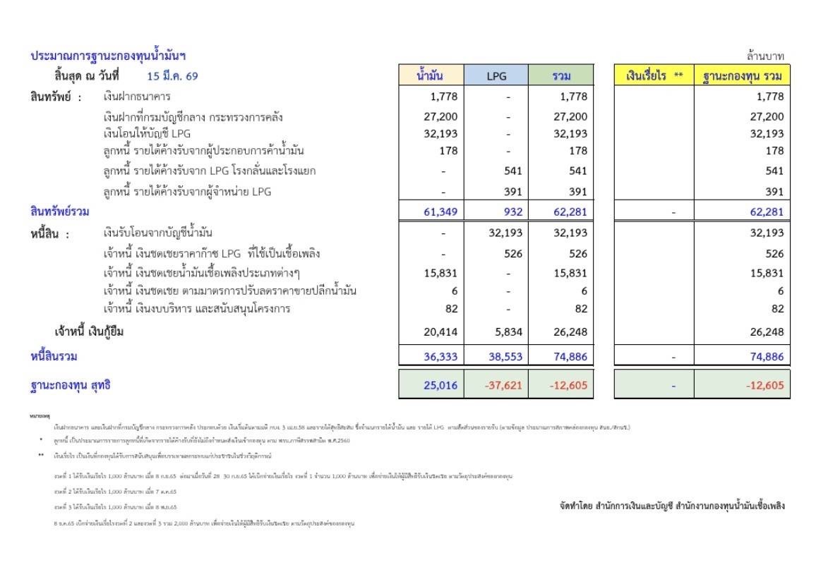 รายงานข่าวระบุว่า จากเหตุการณ์สงครามตะวันออกกลาง ได้ส่งผลต่อราคาน้ำมันทั่วโลก ในขณะที่ประเทศไทย รัฐบาลได้มีมาตรการตรึงราคาน้ำมันดีเซลเอาไว้ที่ 29.94 บาทต่อลิตร โดยใช้กลไกของกองทุนน้ำมันเชื้อเพลิงเข้ามาช่วย ล่าสุด (15 มีนาคม 2569) กองทุนมีสถานะติดลบแล้วที่ 12,605 ล้านบาท