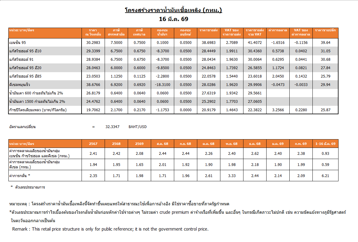 สำหรับการกําหนดอัตราเงินส่งเข้ากองทุนและอัตราเงินชดเชยสําหรับน้ำมันเชื้อเพลิงที่ผลิตภายในราชอาณาจักร เพื่อใช้ภายในราชอาณาจักร พบว่าปัจจุบันน้ำมันดีเซลหมุนเร็วธรรมดามีการชดเชยหรืออุดหนุนอยู่ที่ 18.31 บาท/ลิตร เช่นเดียวกับดีเซล B20 ขณะที่การตรึงราคาจะถึงเพียงแค่วันที่ 17 มีนาคม 2569 นี้เท่านั้น ซึ่งหากกองทุนยังคงอุดหนุนต่ออาจทำให้สถานะกองทุนติดลบเพิ่มขึ้น หรือหากต้องใช้กลไกอ่านก็อาจทำให้เห็นราคาน้ำมันที่ปรับเพิ่มขึ้น