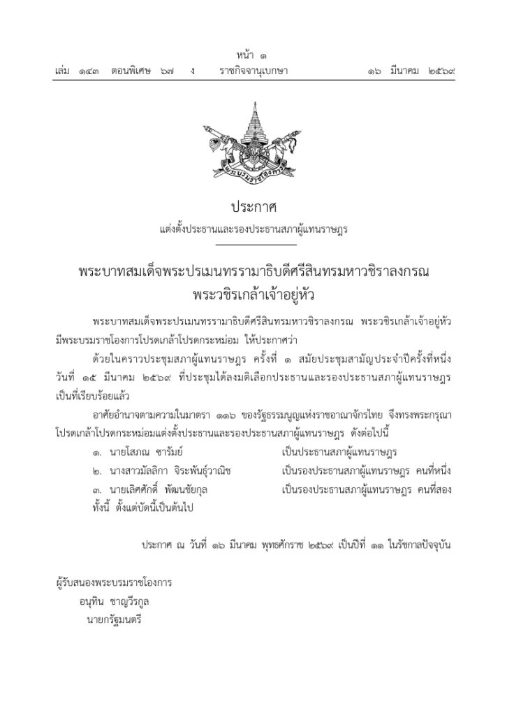 ด้วยในคราวประชุมสภาผู้แทนราษฎร ครั้งที่ 1 สมัยประชุมสามัญประจำปีครั้งที่ 1 วันที่ 15 มีนาคม 2569 ที่ประชุมได้ลงมติเลือกประธานและรองประธานสภาผู้แทนราษฎรเป็นที่เรียบร้อยแล้ว อาศัยอำนาจตามความในมาตรา 116 ของรัฐธรรมนูญแห่งราชอาณาจักรไทย จึงทรงพระกรุณาโปรดเกล้าโปรดกระหม่อมแต่งตั้งประธานและรองประธานสภาผู้แทนราษฎร ดังต่อไปนี้