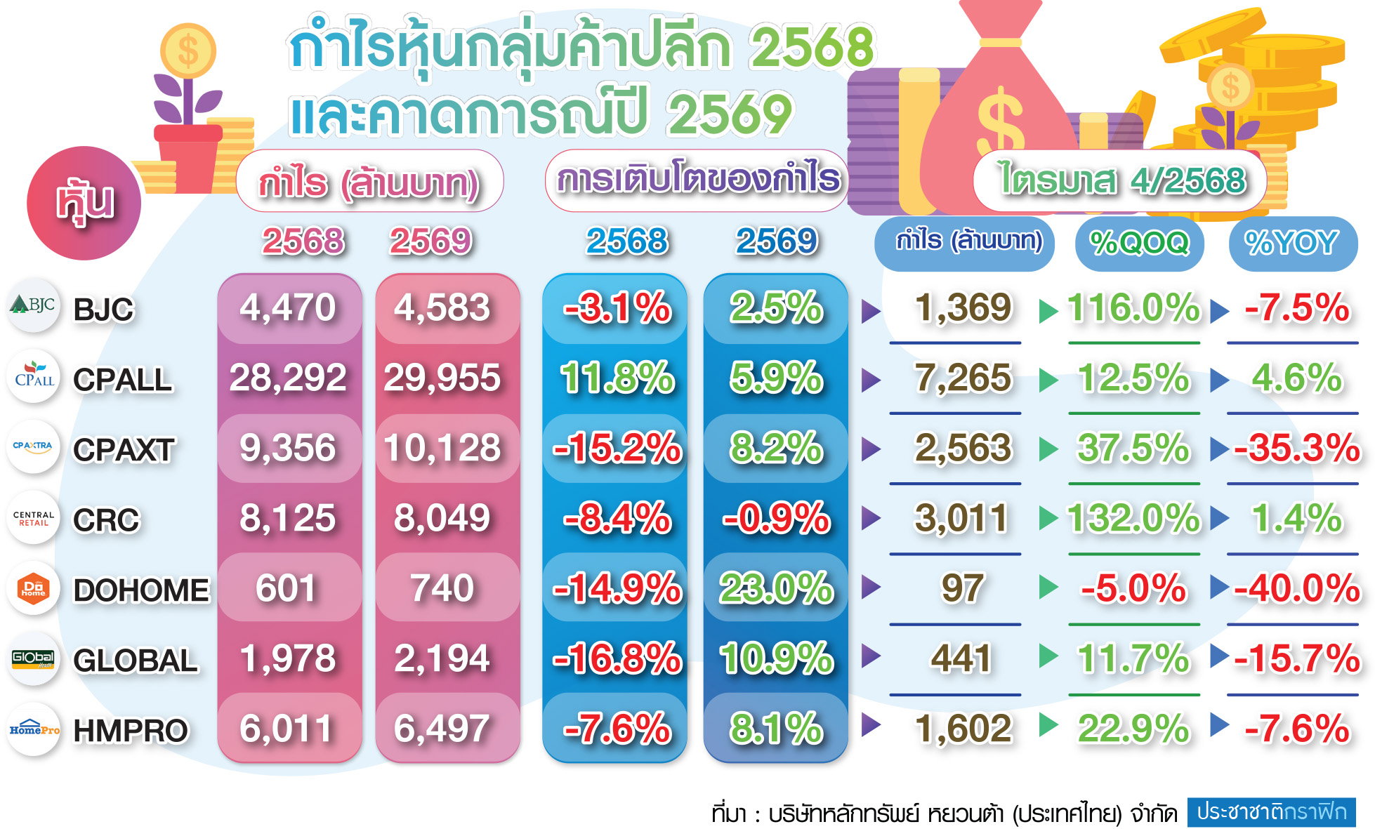 นางสาวจินดานุช ประเวศโชตินันท์ ผู้จัดการฝ่ายวิเคราะห์การลงทุน บริษัทหลักทรัพย์ หยวนต้า (ประเทศไทย) จำกัด เปิดเผยว่า ผลประกอบการของกลุ่มค้าปลีกในช่วงไตรมาส 4 และตลอดปี 2568 ของบริษัทที่อยู่ในการติดตามหลัก 7 บริษัท ได้แก่ บมจ.เบอร์ลี่ ยุคเกอร์ (BJC), บมจ.ซีพี ออลล์ (CPALL), บมจ.ซีพี แอ็กซ์ตร้า (CPAXT), บมจ.เซ็นทรัล รีเทล คอร์ปอเรชั่น (CRC), บจม.ดูโฮม (DOHOME), บมจ.สยามโกลบอลเฮ้าส์ (GLOBAL) และ บมจ.โฮม โปรดักส์ เซ็นเตอร์ (HMPRO) ออกมาไม่ค่อยสดใสนัก โดยกำไรของผู้ประกอบการส่วนใหญ่ปรับตัวลดลงเมื่อเทียบกับปีก่อนหน้า (YOY) โดยมีเพียง CPALL เพียงรายเดียวที่กำไรปี 2568 ยังเติบโต