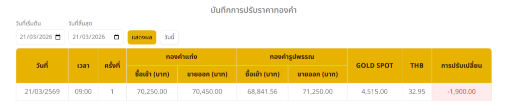 อ่านข่าวต้นฉบับ: ราคาทองวันนี้ (21 มี.ค. 69) ปรับลง 1,900 บาท ทองรูปพรรณบาทละ 73,150 บาท