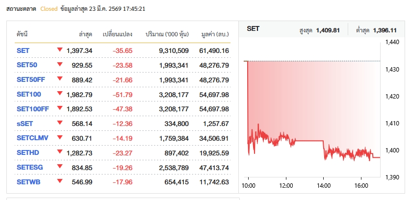 หุ้นไทยปิดตลาด (23 มี.ค.) ดัชนี 1,397.34 จุด ดิ่ง 35.65 จุด ต่างชาติขายสุทธิกว่า 6,200 ล้าน บล.อินโนเวสท์ เอกซ์ ชี้ SET ปรับลงตามทิศทางภูมิภาค กลุ่มไฟแนนซ์ลดแรง-หุ้นพลังงานปรับขึ้นสวนทางตลาด