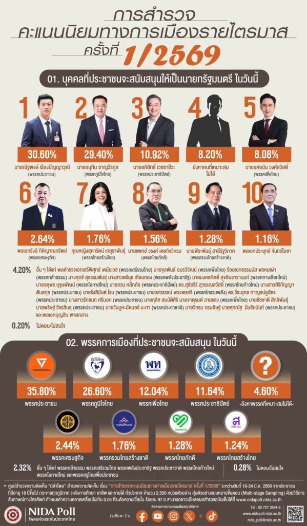 ศูนย์สำรวจความคิดเห็น “นิด้าโพล” สถาบันบัณฑิตพัฒนบริหารศาสตร์ (นิด้า) เผยผลสำรวจความคิดเห็น เรื่อง “การสำรวจคะแนนนิยมทางการเมืองรายไตรมาส ครั้งที่ 1/2569” ระหว่างวันที่ 19-24 มี.ค. 2569 จากประชาชนที่มีอายุ 18 ปีขึ้นไป กระจายทุกภูมิภาค ระดับการศึกษา อาชีพ และรายได้ ทั่วประเทศ 2,500 หน่วยตัวอย่าง เกี่ยวกับคะแนนนิยมทางการเมือง