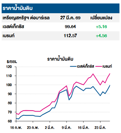 โดยราคาน้ำมันดิบเวสต์เทกซัสซื้อขายเมื่อ 27 มี.ค. 2569 อยู่ที่ 99.64 เหรียญสหรัฐต่อบาร์เรล เพิ่มขึ้น +5.16 เหรียญสหรัฐต่อบาร์เรล และราคาน้ำมันดิบเบรนต์อยู่ที่ 112.57 เหรียญสหรัฐต่อบาร์เรล เพิ่มขึ้น +4.56 เหรียญสหรัฐต่อบาร์เรล
