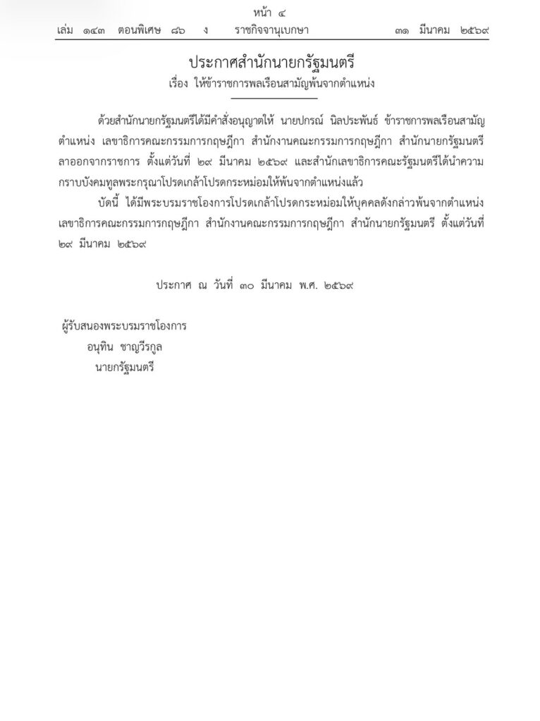 บัดนี้ ได้มีพระบรมราชโองการโปรดเกล้าโปรดกระหม่อมให้บุคคลดังกล่าวพ้นจากตำแหน่งเลขาธิการคณะกรรมการกฤษฎีกา สำนักงานคณะกรรมการกฤษฎีกา สำนักนายกรัฐมนตรี ตั้งแต่วันที่ 29 มี.ค.2569
