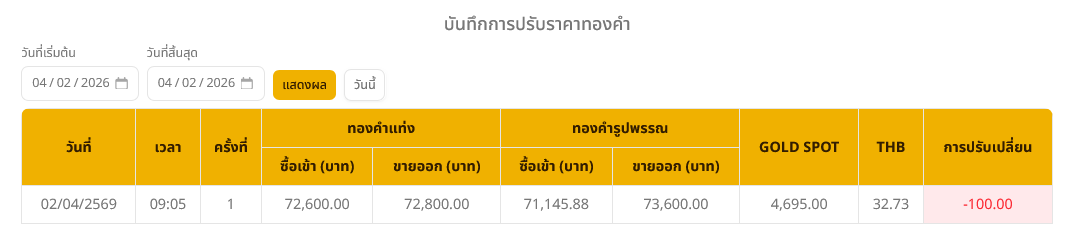 ด้านราคาทองรูปพรรณ รับซื้ออยู่ที่บาทละ 71,145.88 บาท และมีราคาขายออกที่ 73,600.00 บาท ทั้งนี้ ในส่วนของราคาทองคำโลก (Gold Spot) อยู่ที่ระดับ 4,695.00 ดอลลาร์ต่อออนซ์