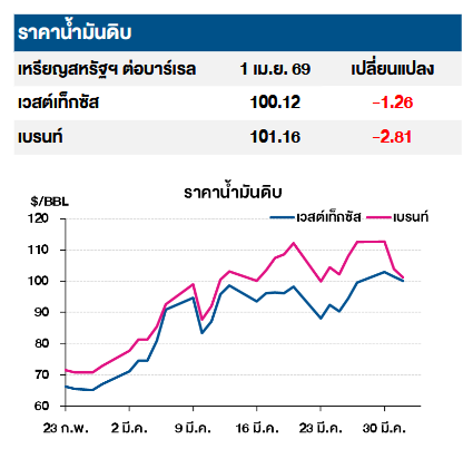 โดยราคาน้ำมันดิบเวสต์เทกซัสซื้อขายเมื่อ 1 เม.ย. 69 อยู่ที่ 100.12 เหรียญสหรัฐต่อบาร์เรล ลดลง -1.26 เหรียญสหรัฐ และราคาน้ำมันเบรนต์อยู่ที่ 101.16 เหรียญสหรัฐต่อบาร์เรล ลดลง -2.8