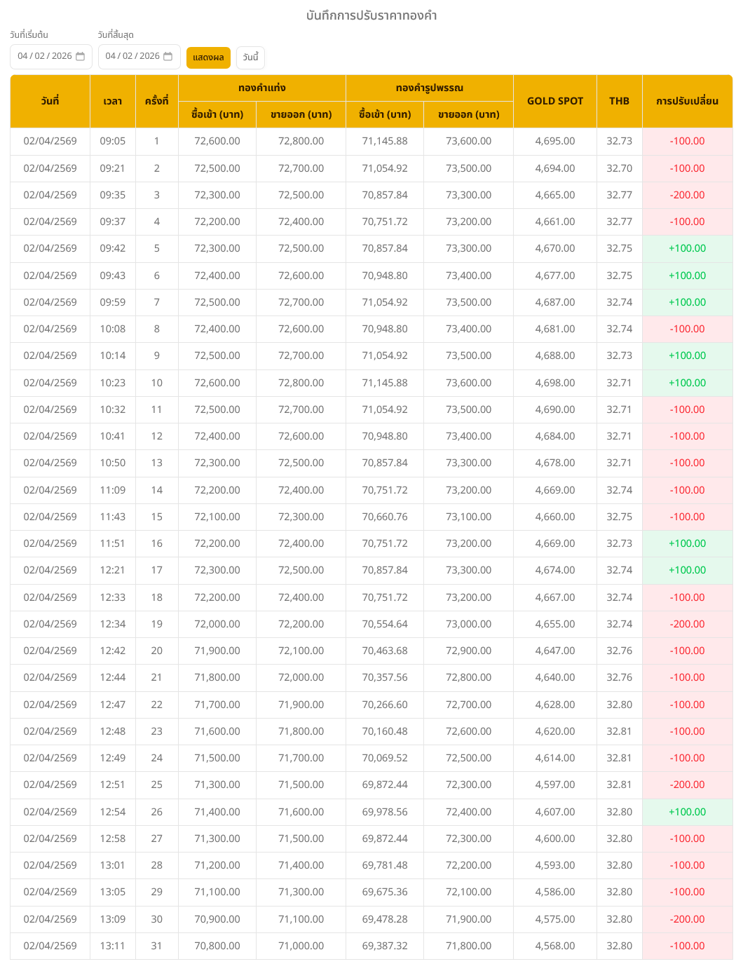 ด้านราคาทองรูปพรรณ รับซื้ออยู่ที่บาทละ 69,387.32 บาท และมีราคาขายออกที่ 71,800.00 บาท ทั้งนี้ ในส่วนของราคาทองคำโลก (Gold Spot) อยู่ที่ระดับ 4,568.00 ดอลลาร์ต่อออนซ์