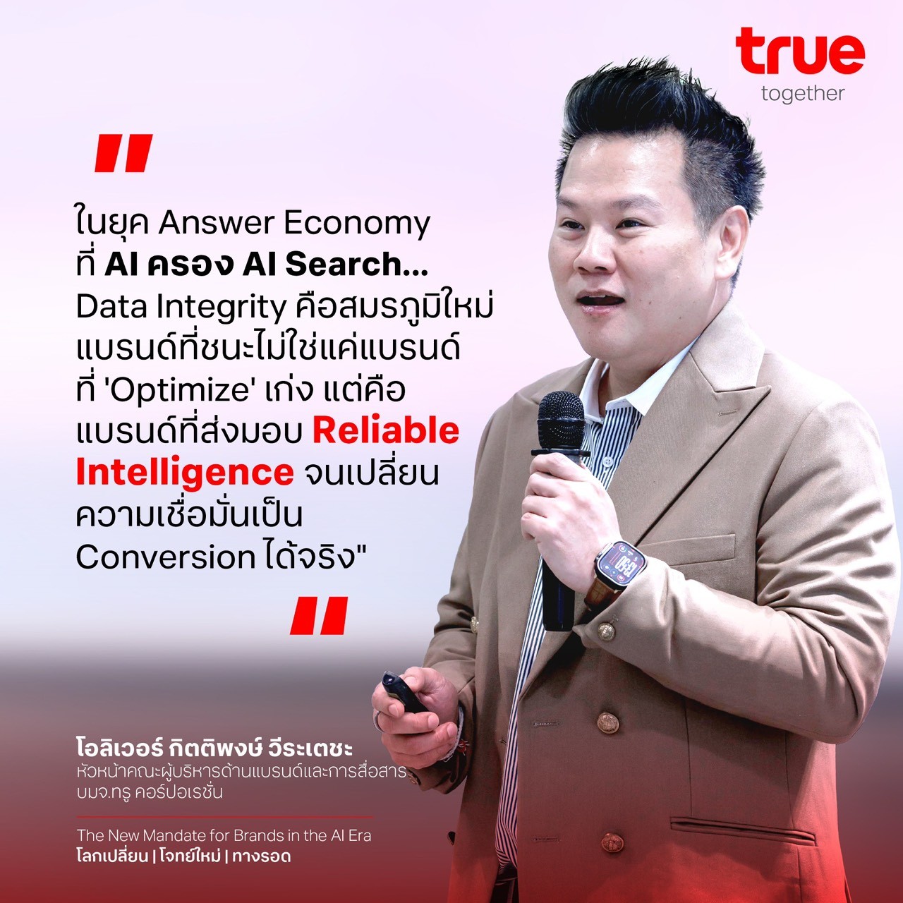 ในโลกดิจิทัลที่ AI กำลัง Re-shape พฤติกรรมผู้บริโภคจากการเข้าถึงข้อมูลด้วย Search Engine Optimization (SEO) สู่ Generative Engine Optimization (GEO) ที่ไม่เพียง “ค้นหา” แต่ต้องนำไปสู่ “การถามเพื่อให้ได้คำตอบที่ดีที่สุด” ทำให้ “การสนทนากับ AI” กลายเป็นจุดเริ่มต้นของการตัดสินใจมากขึ้น ในยุค Answer Economy บนเวที “The New Mandate for Brands in the AI Era” คุณโอลิเวอร์ กิตติพงษ์ วีระเตชะ หัวหน้าคณะผู้บริหารด้านแบรนด์และการสื่อสาร บมจ.ทรู คอร์ปอเรชั่น ได้ร่วมแบ่งปันมุมมองในหัวข้อ “The Authority Bandwagon: Why Brands Must Become the Source of Truth” ชี้ให้เห็นว่า ธุรกิจไทยที่จะก้าวข้ามความท้าทายและอยู่ในใจผู้บริโภคได้นั้น ต้องยกระดับบทบาทจาก “ผู้สื่อสาร” ไปสู่การเป็น “Source of Truth” หรือแหล่งที่ให้ข้อมูลได้ครบถ้วน ถูกต้อง และน่าเชื่อถือ เพื่อให้ AI เลือกใช้อ้างอิงและนำไปสู่คำตอบที่ดีที่สุดที่ถูกเลือกโดยผู้บริโภคในท้ายที่สุด