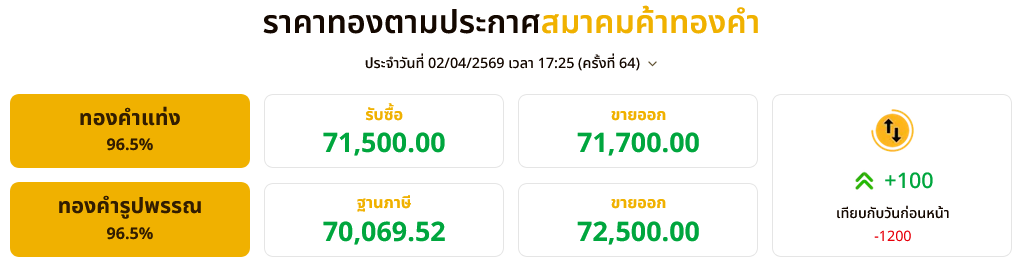 อ่านข่าวต้นฉบับ: ราคาทองวันนี้ (2 เม.ย. 69) ปรับลง 1,200 บาท ทองรูปพรรณบาทละ 72,500 บาท