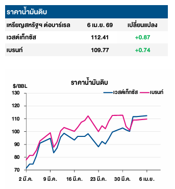 โดยราคาน้ำมันดิบเวสต์เทกซัสซื้อขายเมื่อ 6 เม.ย. 2569 อยู่ที่ 112.41 เหรียญสหรัฐต่อบาร์เรล เพิ่มขึ้น +0.87 เหรียญสหรัฐต่อบาร์เรล และราคาน้ำมันดิบเบรนต์อยู่ที่ 109.77 เหรียญสหรัฐต่อบาร์เรล เพิ่มขึ้น +0.74 เหรียญสหรัฐต่อบาร์เรล