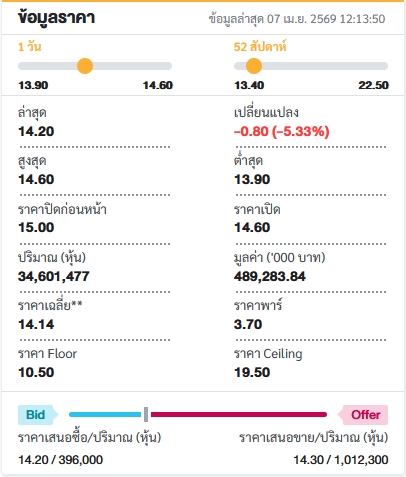 ผู้สื่อข่าวรายงานว่า วันนี้ (7 เม.ย.) หุ้นบริษัท ติดล้อ โฮลดิ้งส์ จำกัด (มหาชน) หรือ TIDLOR ครึ่งวันเช้าราคาอยู่ที่ 14.20 บาท ปรับลดลง 0.80 บาท (-5.33%) หลังจากบริษัทได้แจ้งถึงการลาออกของนายปิยะศักดิ์ อุกฤษฎ์นุกูล กรรมการผู้จัดการใหญ่