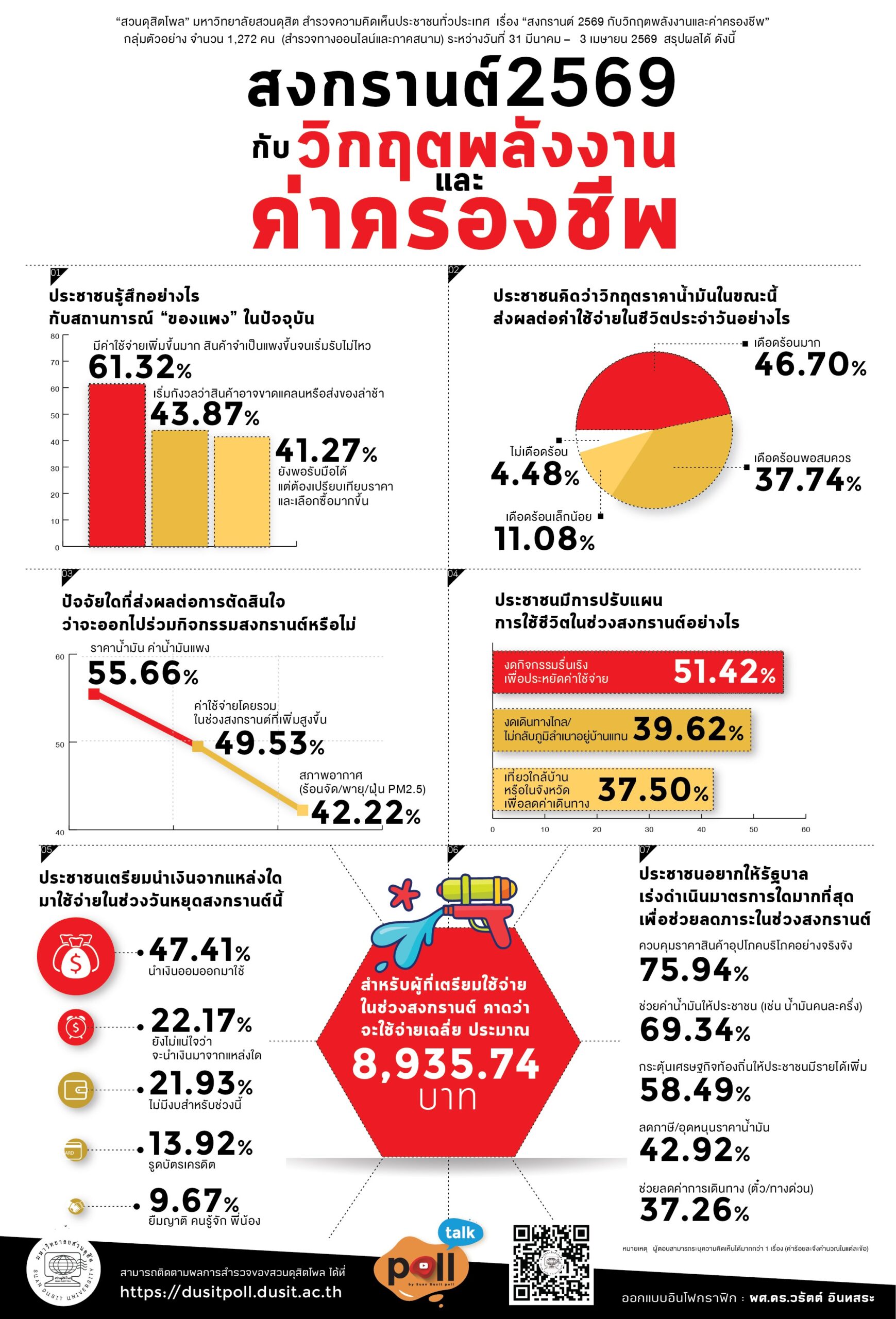 ผู้สื่อข่าวรายงานว่า “สวนดุสิตโพล” มหาวิทยาลัยสวนดุสิต สำรวจความคิดเห็นประชาชนทั่วประเทศ เรื่อง “สงกรานต์ 2569 กับวิกฤตพลังงานและค่าครองชีพ” กลุ่มตัวอย่างจำนวน 1,272 คน (สำรวจทางออนไลน์และภาคสนาม) ระหว่างวันที่ 31 มีนาคม – 3 เมษายน 2569