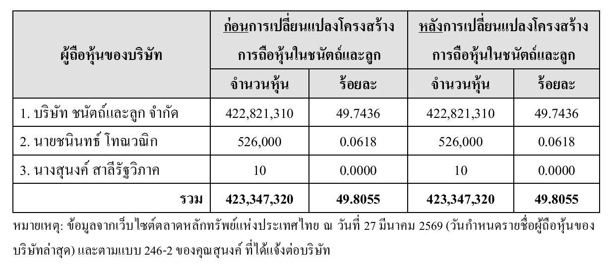 เอกสารดังกล่าว ระบุว่า บริษัทขอแจ้งให้ทราบว่า ภายหลังจากที่บริษัทได้เเจ้งข้อมูลต่อตลาดหลักทรัพย์แห่งประเทศไทยตามที่อ้างถึงข้างต้นแล้ว บริษัทได้รับแจ้งการเปลี่ยนแปลงโครงสร้างการถือหุ้นในบริษัท ชนัตถ์และลูก จำกัด ซึ่งเป็นผู้ถือหุ้นรายใหญ่ของบริษัท (ถือหุ้นในบริษัทในสัดส่วนร้อยละ 49.74 ของหุ้นที่ออกจำหน่ายแล้วทั้งหมดของบริษัท) ซึ่งสรุปได้ดังนี้