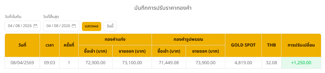 ราคาทองวันนี้ (8 เมษายน 2569) พุ่งขึ้น 1,250 บาท เมื่อเปรียบเทียบกับราคาปิดวานนี้ โดยราคาทองรูปพรรณขยับมาอยู่ที่บาทละ 73,900.00 บาท ตามข้อมูลล่าสุด จากเว็บไซต์ของสมาคมค้าทองคำ เมื่อเวลา 09.03 น.ที่ผ่านมา