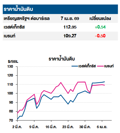 โดยราคาน้ำมันดิบเวสต์เทกซัสซื้อขายเมื่อ 7 เม.ย. 2569 อยู่ที่ 112.95 เหรียญสหรัฐต่อบาร์เรล เพิ่มขึ้น +0.54 เหรียญสหรัฐต่อบาร์เรล และราคาน้ำมันดิบเบรนต์อยู่ที่ 109.27 เหรียญสหรัฐต่อบาร์เรล ลดลง -0.50 เหรียญสหรัฐต่อบาร์เรล