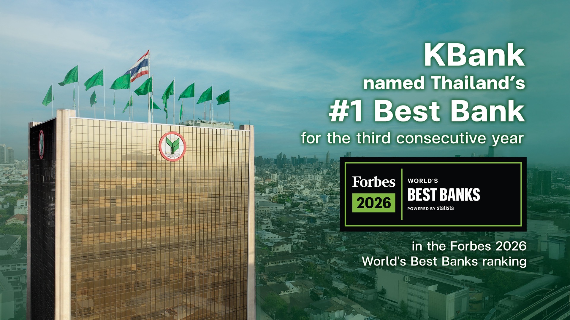 ธนาคารกสิกรไทย ได้รับการจัดอันดับเป็นธนาคารที่ดีที่สุดอันดับ 1 ในประเทศไทย จาก Forbes 2026 World’s Best Banks เป็นปีที่ 3 ติดต่อกัน