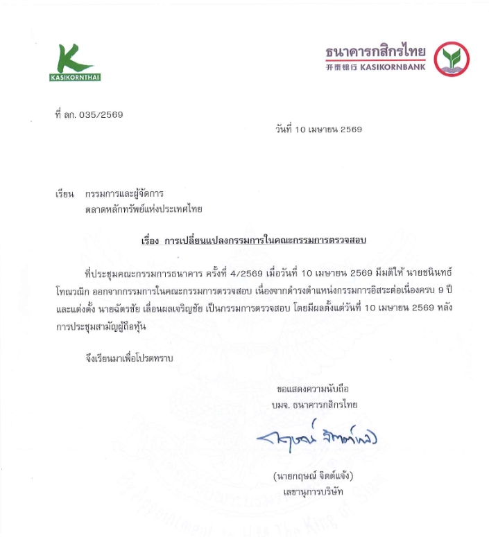 ธนาคารกสิกรไทย (KBANK) แจ้งตลาดหลักทรัพย์ฯ ว่า ที่ประชุมคณะกรรมการธนาคาร ครั้งที่ 4/2569 เมื่อวันที่ 10 เมษายน 2569 มีมติให้ นายชนินทธ์ โทณวณิก ออกจากกรรมการในคณะกรรมการตรวจสอบ เนื่องจากดำรงตำแหน่งกรรมการอิสระต่อเนื่องครบ 9 ปี และแต่งตั้ง นายฉัตรชัย เลื่อนผลเจริญชัย เป็นกรรมการตรวจสอบ โดยมีผลตั้งแต่วันที่ 10 เมษายน 2569 หลังการประชุมสามัญผู้ถือหุ้น