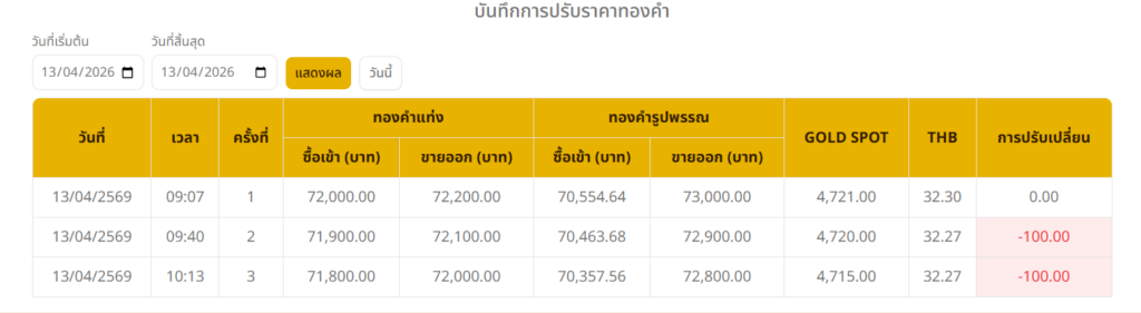 อ่านข่าวต้นฉบับ: ราคาทองวันนี้ (13 เม.ย. 69) ปรับลง 200 บาท ทองรูปพรรณบาทละ 72,800 บาท