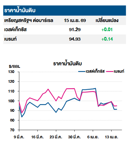 โดยราคาน้ำมันดิบเวสต์เทกซัสซื้อขายเมื่อ 15 เม.ย. 69 อยู่ที่ 91.29 เหรียญสหรัฐต่อบาร์เรล เพิ่มขึ้น +0.01 เหรียญสหรัฐ และราคาน้ำมันเบรนต์อยู่ที่ 94.93 เหรียญสหรัฐต่อบาร์เรล เพิ่มขึ้น +0.14