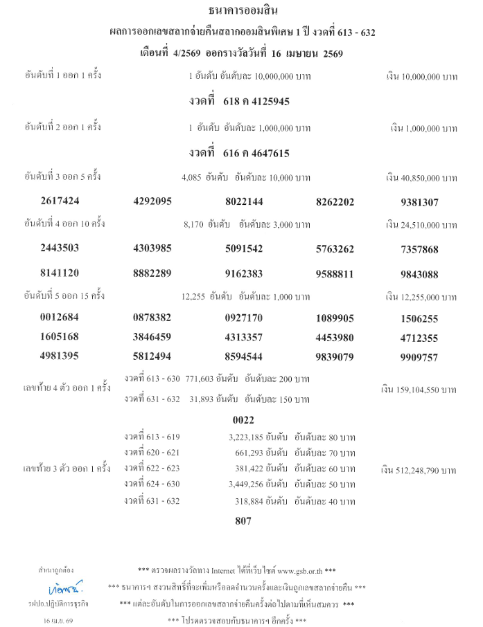 ผลการออกรางวัลเลขสลากจ่ายคืนสลากออมสินพิเศษ 1 ปี งวดที่ 613-632 เดือนที่ 4/2569 ออกรางวัลวันที่ 16 เมษายน 2569 ตรวจเช็กผลรางวัลที่นี่ !