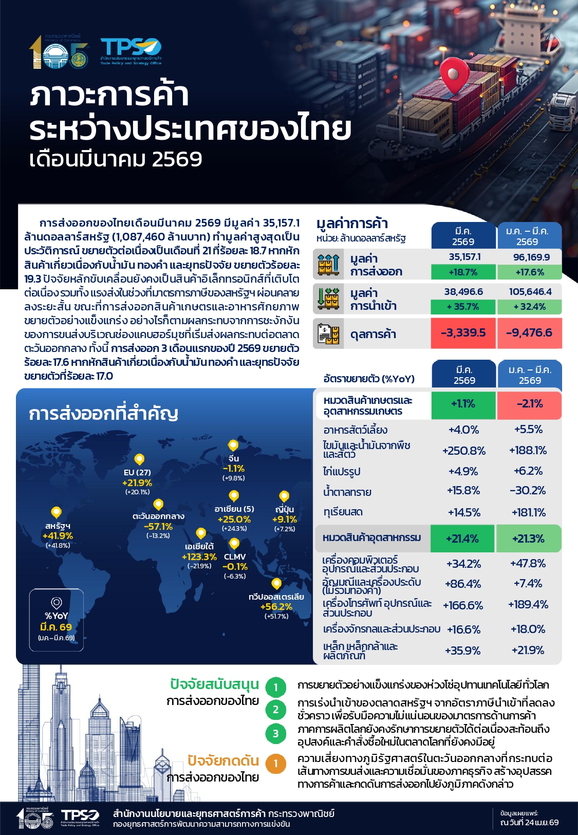 สนค.เผยส่งออก มี.ค. 2569 แตะ 35,157 ล้านดอลลาร์สหรัฐ สูงสุดเป็นประวัติการณ์ ขยายตัว 18.7% ต่อเนื่องเดือนที่ 21 จากแรงหนุนสินค้าอิเล็กทรอนิกส์-Data Center และอาหารศักยภาพ ขณะนำเข้าโตแรง 35.7% ดันดุลการค้าขาดดุล 3,339 ล้านดอลลาร์ จับตาความเสี่ยงตะวันออกกลาง-ค่าขนส่งกดตลาดตะวันออกกลางเริ่มหดตัว