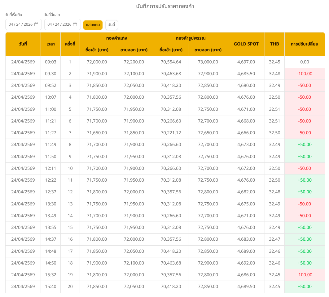 อ่านข่าวต้นฉบับ: ราคาทองวันนี้ (24 เม.ย. 69) ปรับลง 150 บาท ทองรูปพรรณบาทละ 72,850 บาท