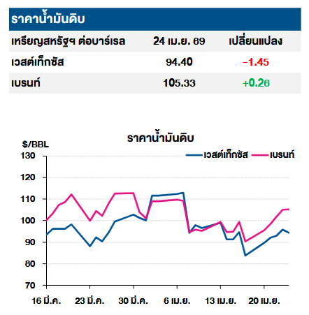 โดยราคาน้ำมันดิบเวสต์เท็กซัสซื้อขายเมื่อ 24 เม.ย. 2569 อยู่ที่ 94.40 เหรียญสหรัฐต่อบาร์เรล ลดลง -1.45 เหรียญสหรัฐต่อบาร์เรล และราคาน้ำมันดิบเบรนต์อยู่ที่ 105.33 เหรียญสหรัฐต่อบาร์เรล เพิ่มขึ้น +0.26 เหรียญสหรัฐต่อบาร์เรล